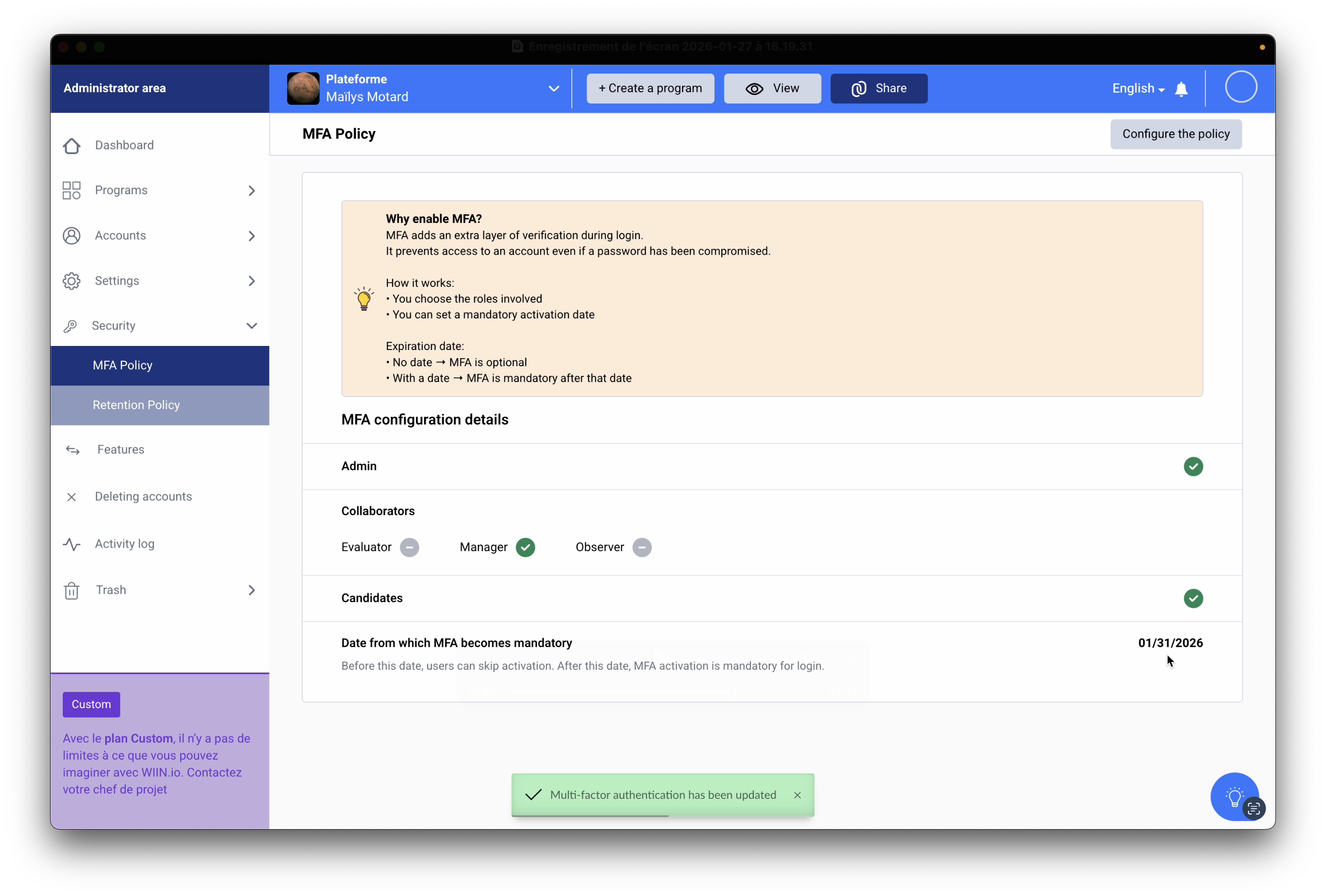 Multi-factor authentication (MFA) is an essential security measure to reinforce the protection of user accounts on the platform. Once you have activated MFA, we recommend that you configure your policy so that it can be proposed or imposed on your users (employees and/or applicants).
