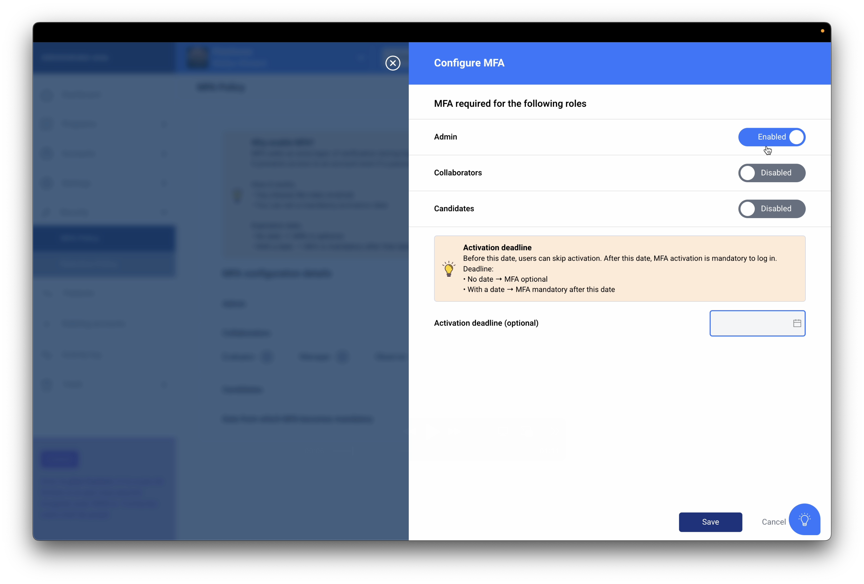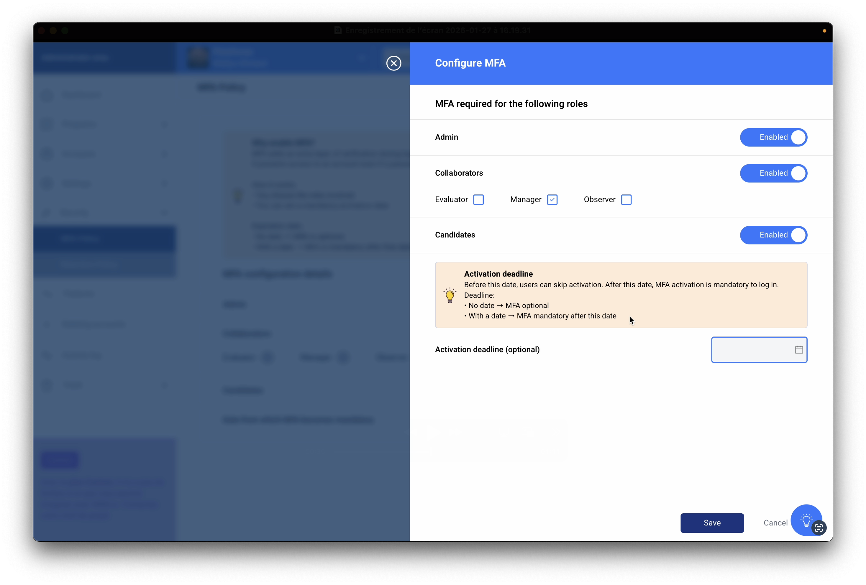 MFA activation can be configured for each role on the platform (admin, employee, candidate).