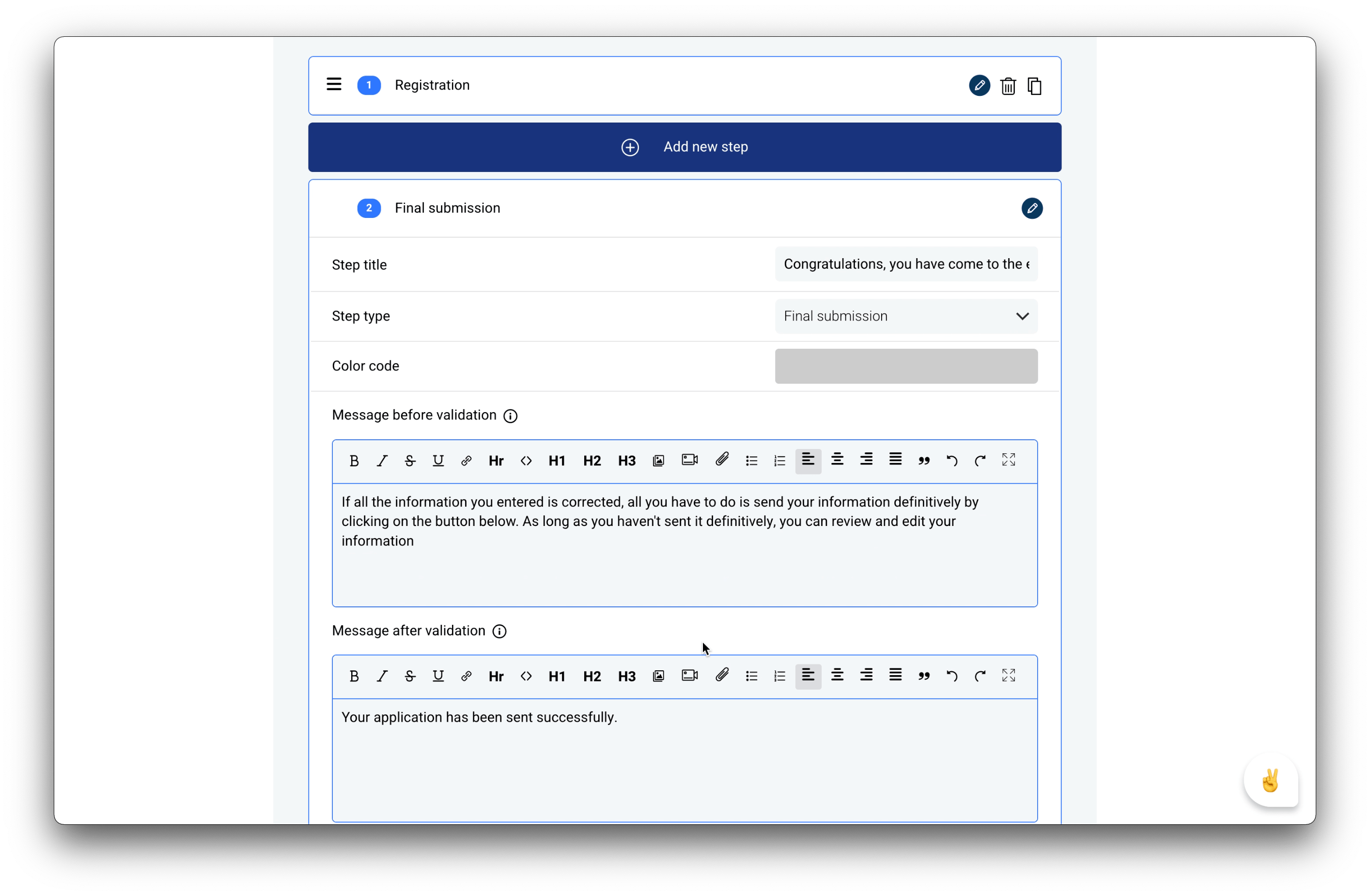We invite you to consult our article on how to create a form, for more details.The final send step allows you to setup the message before, and after, submitting a file.