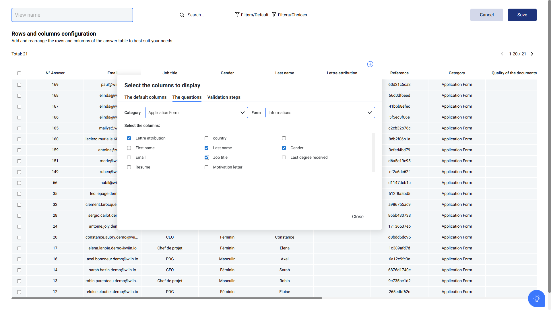 Add other columns: depending on the questions in your forms, select the form and questions you want to add to your view in the “Questions” tab.