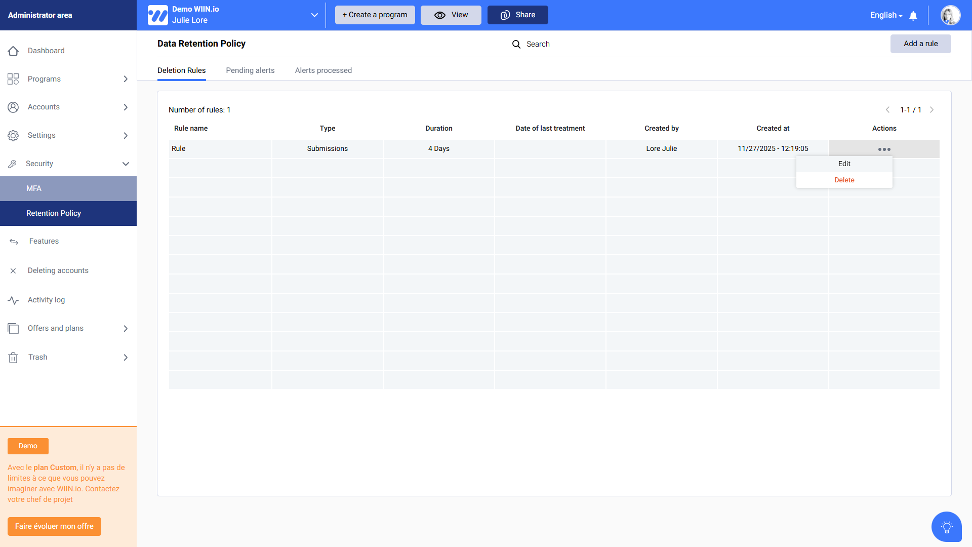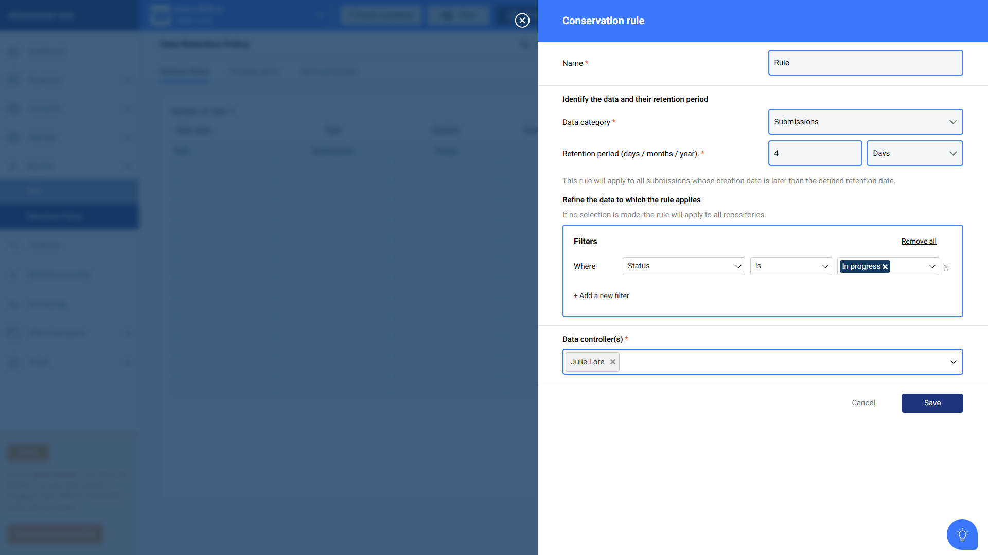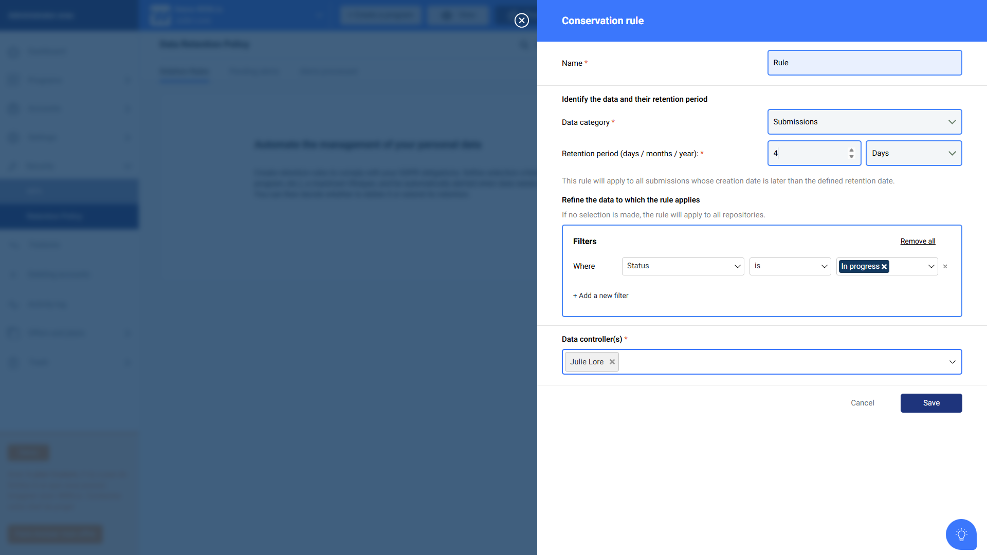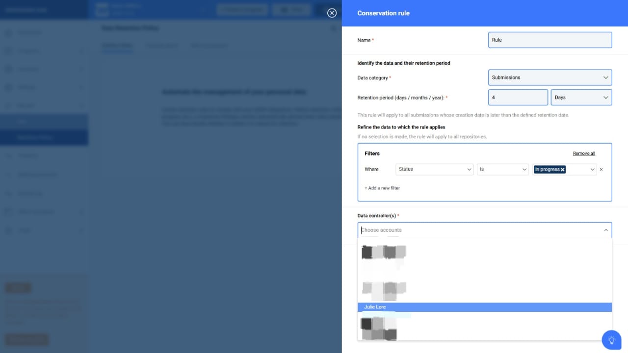 The retention policy defines how long data collected on your platform is stored. It ensures regulatory compliance (GDPR), controls storage, and monitors access to information.