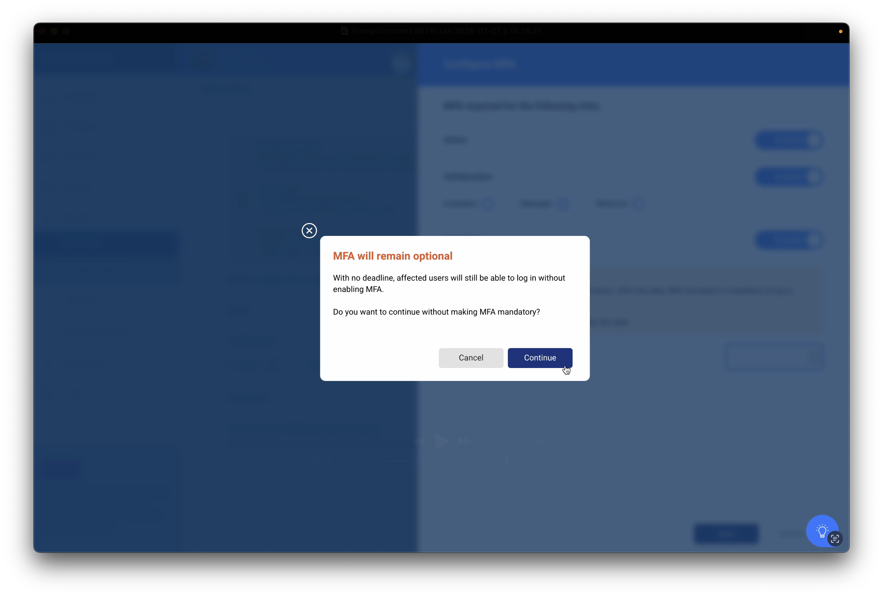 Si vous n'avez pas configuré de date limite d'activation, vous aurez un message de confirmation après avoir sauvegardé pour confirmer que sans cette date, le MFA ne sera jamais imposé aux comptes sélectionnés mais toujours proposé de manière aléatoire et sans obligation.