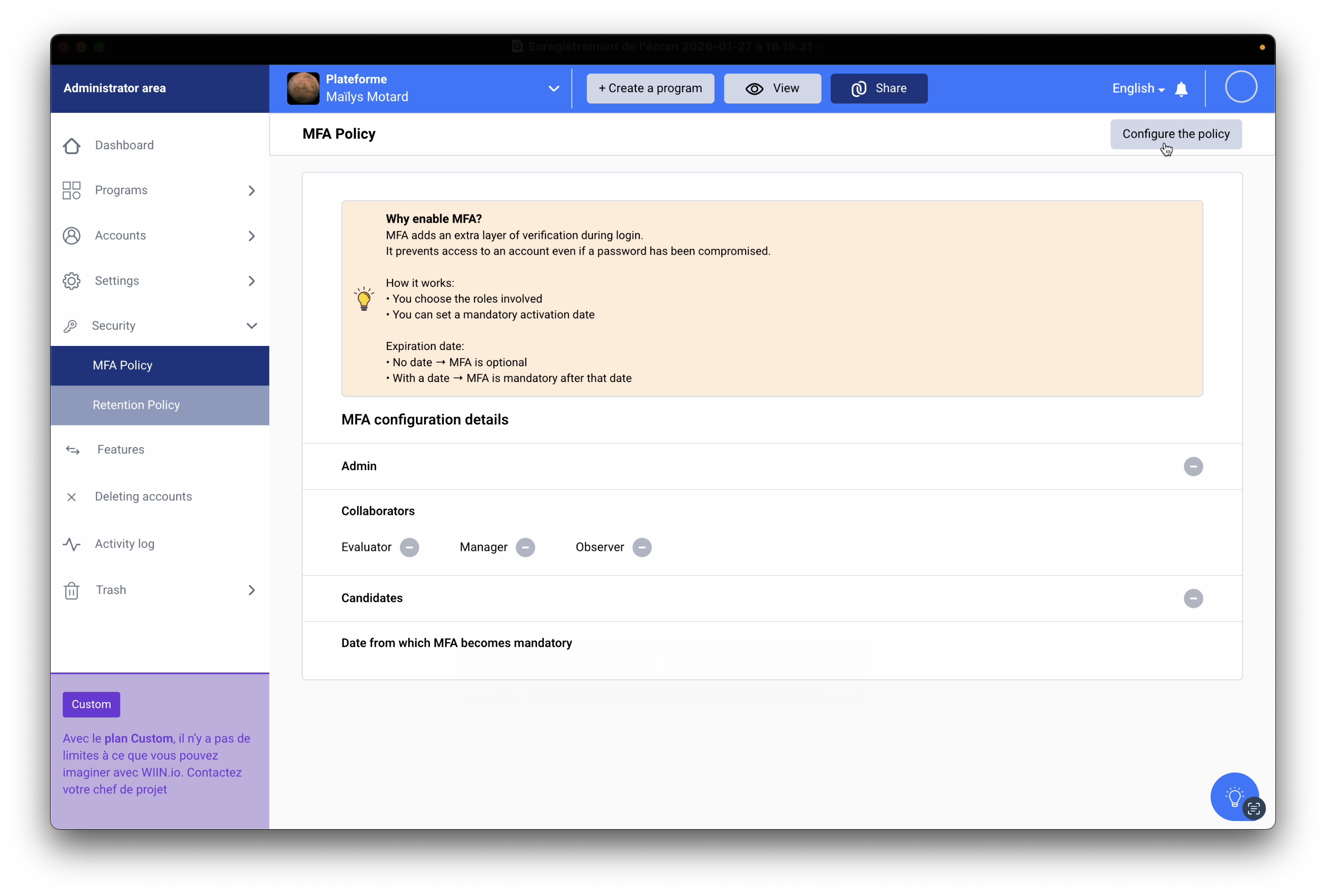 L’authentification multifacteur (MFA) est une mesure de sécurité essentielle pour renforcer la protection des comptes utilisateurs sur la plateforme. Après avoir activé le MFA, il est recommandé de configurer sa politique afin de le proposer ou l'imposer à vos utilisateurs (collaborateurs et/ou candidats).