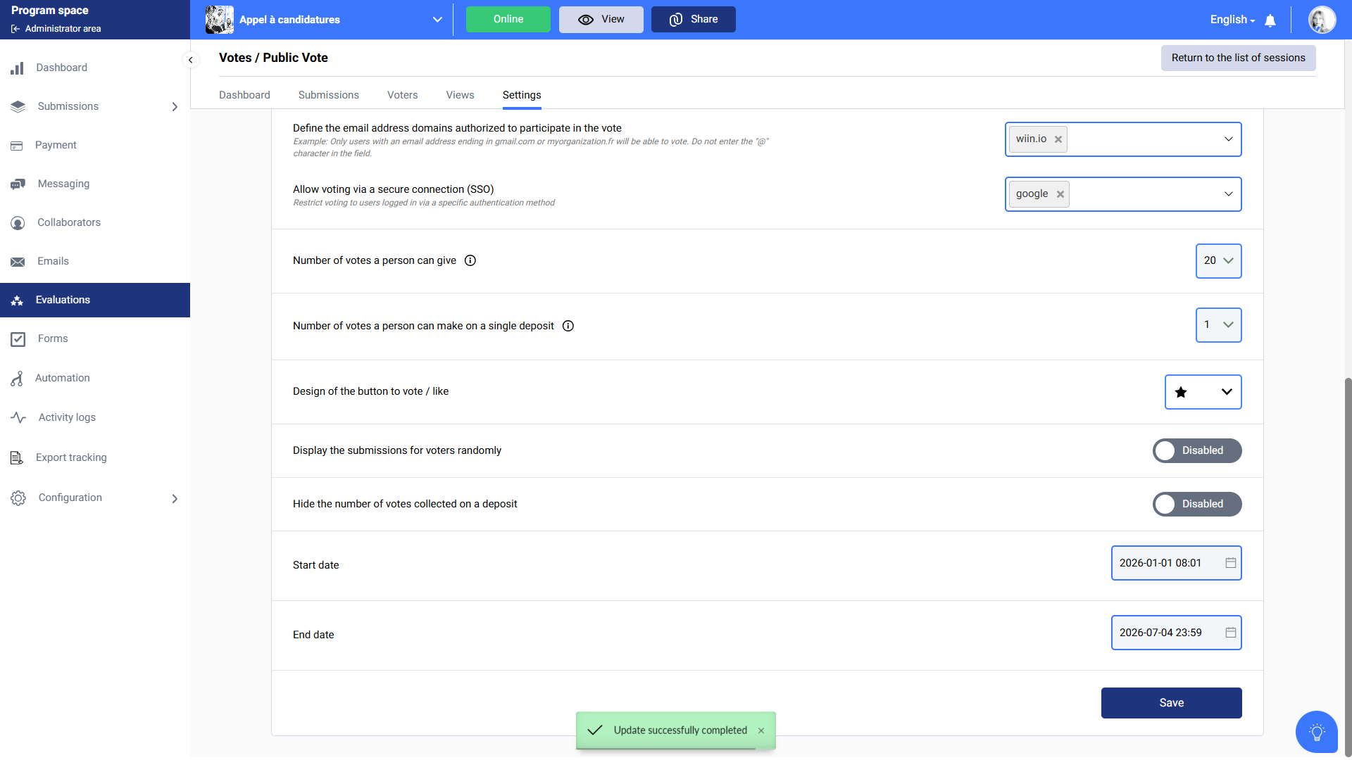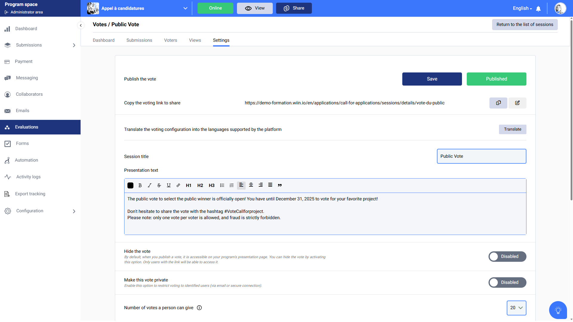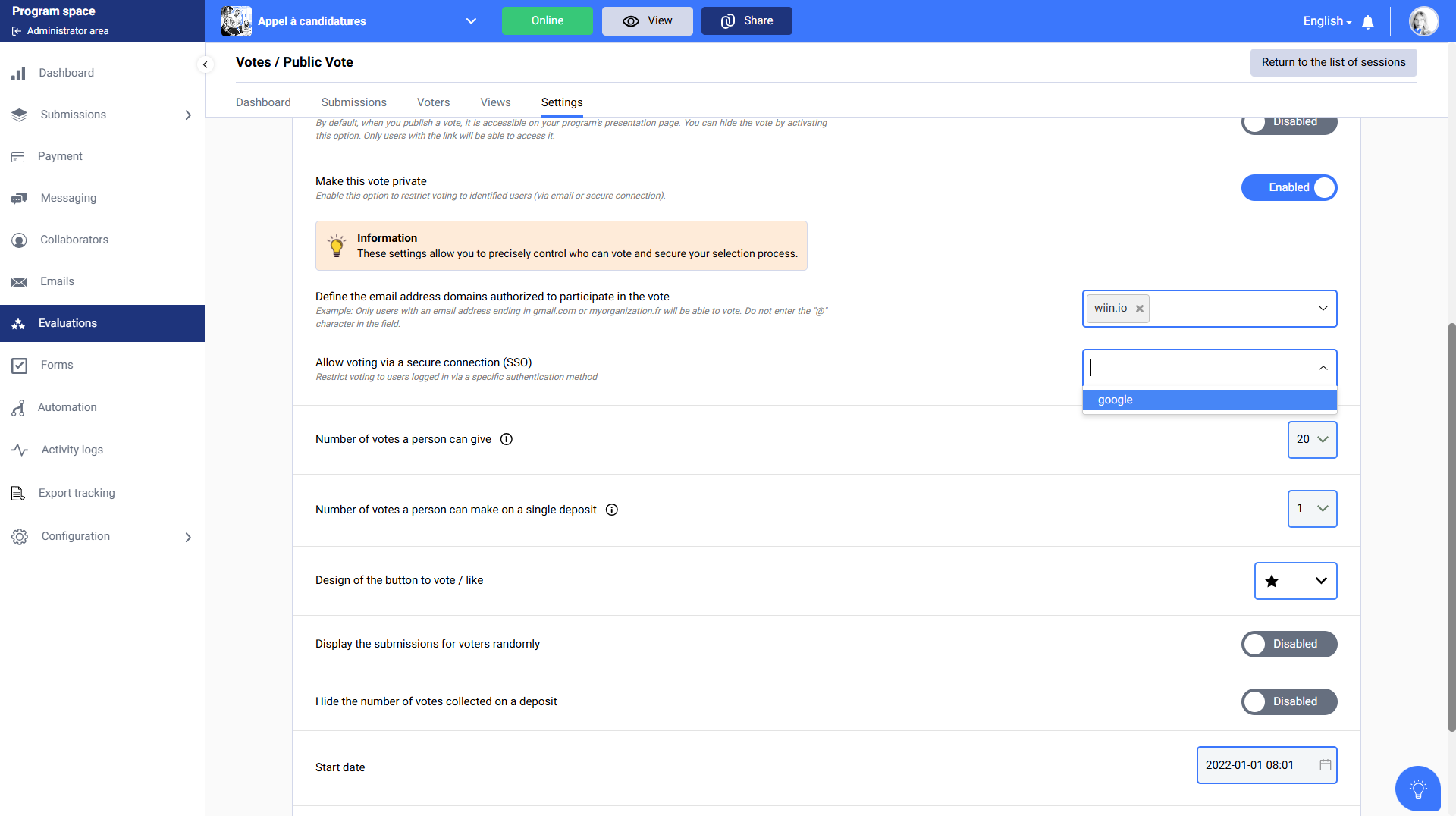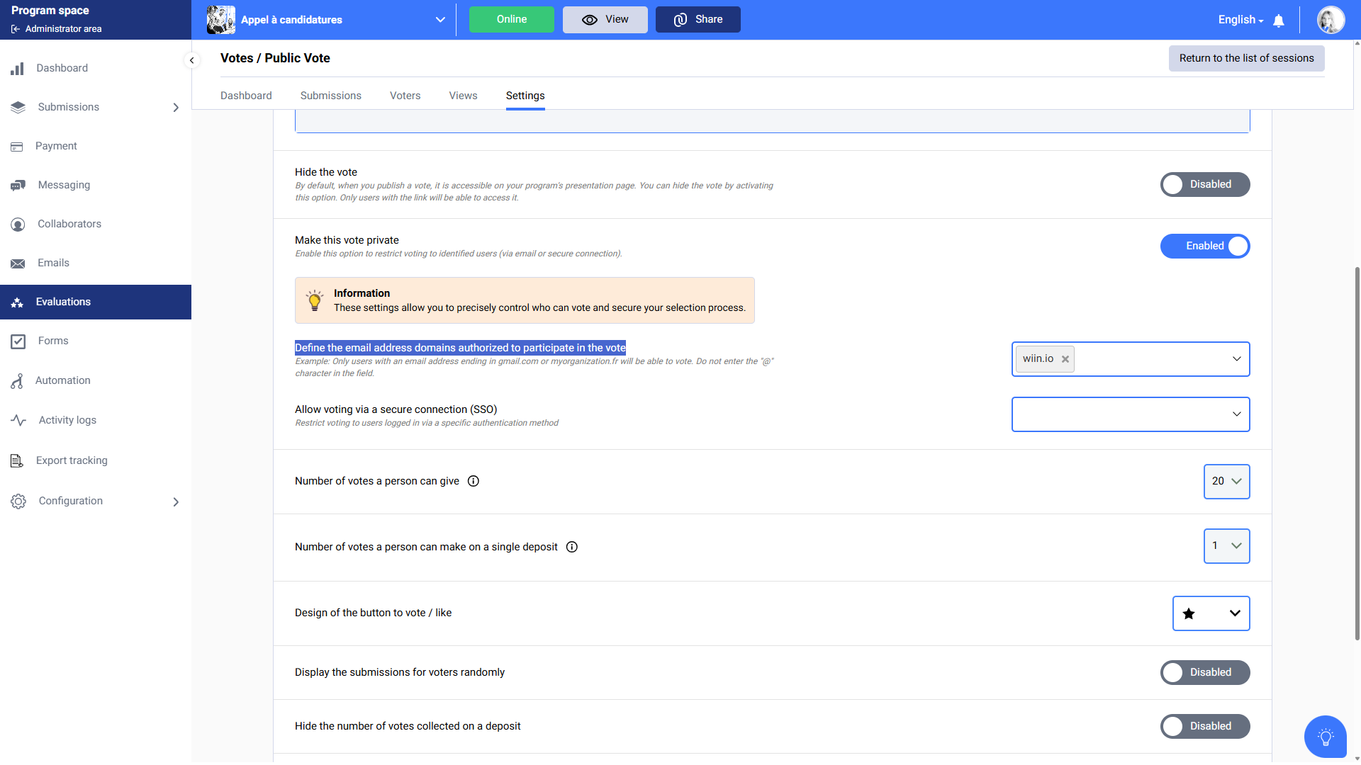 Sur la plateforme, vous pouvez créer une session de vote et la configurer pour qu’elle soit privée. En activant cette option, l’accès au vote est limité aux seuls utilisateurs autorisés. Les participants devront être identifiés, soit par e-mail, soit via une connexion sécurisée, pour pouvoir accéder au vote et soumettre leur choix.