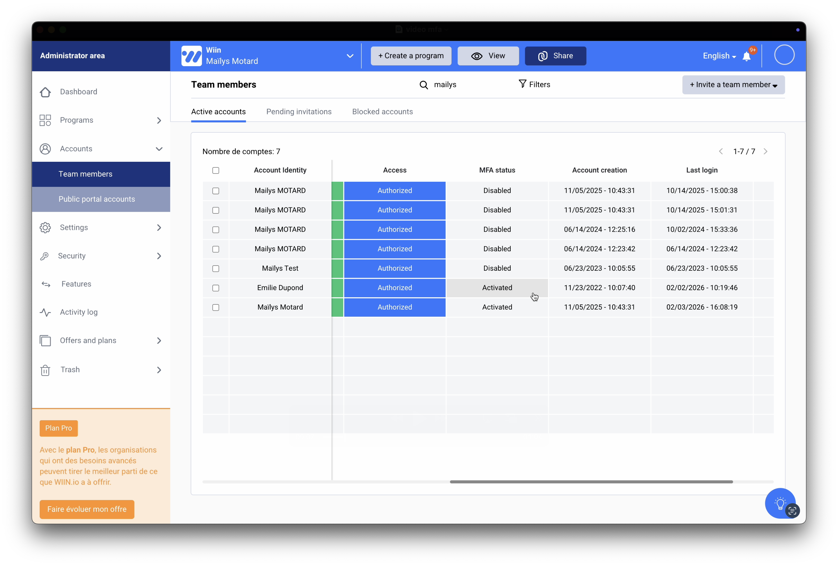 Dans le sous-menu « Membres d’équipes » du compte, vous avez la colonne « Statut du MFA » qui affiche le statut des comptes. Cliquez ensuite sur le compte pour lequel vous souhaitez désactiver le MFA.
