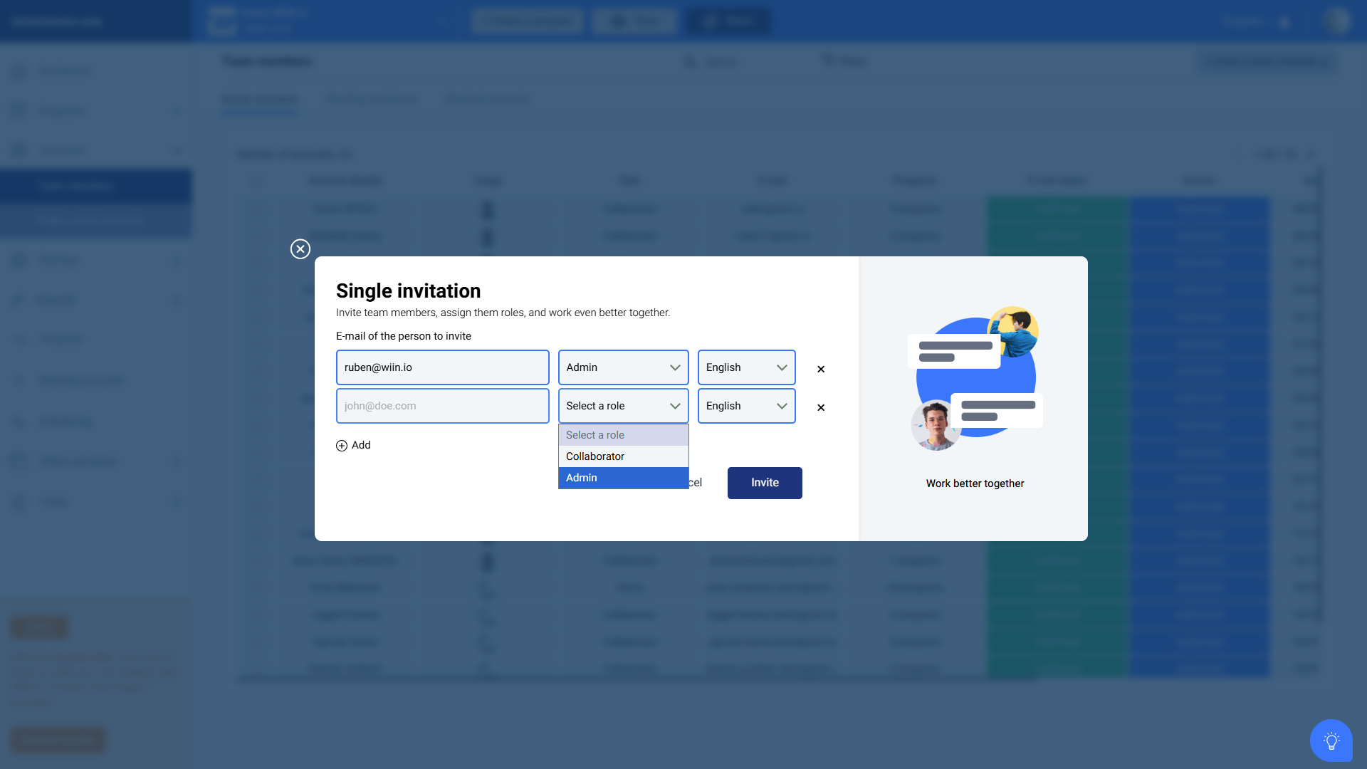 Vous devrez ensuite renseignez l'adresse e-mail de la personne que vous souhaitez inviter, sélectionnez le rôle administrateur, puis cliquez sur le bouton "Inviter".