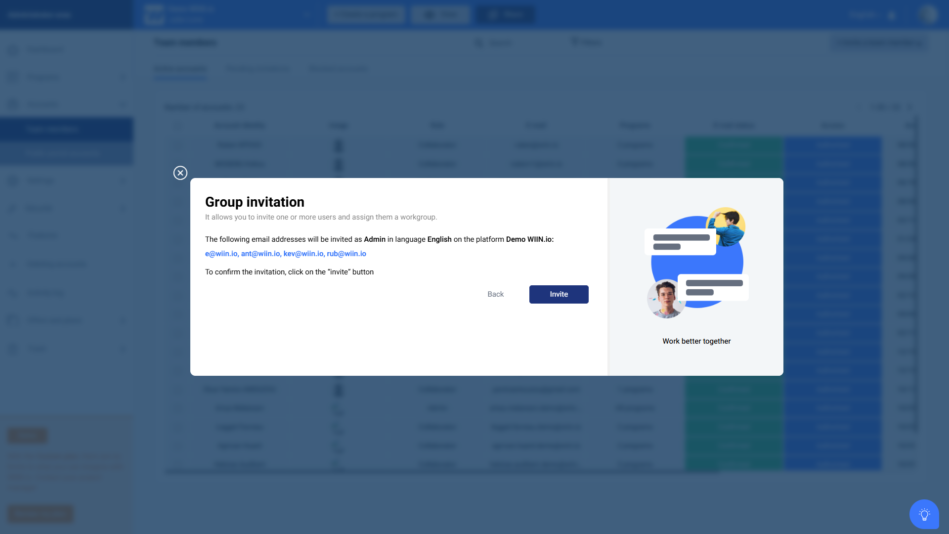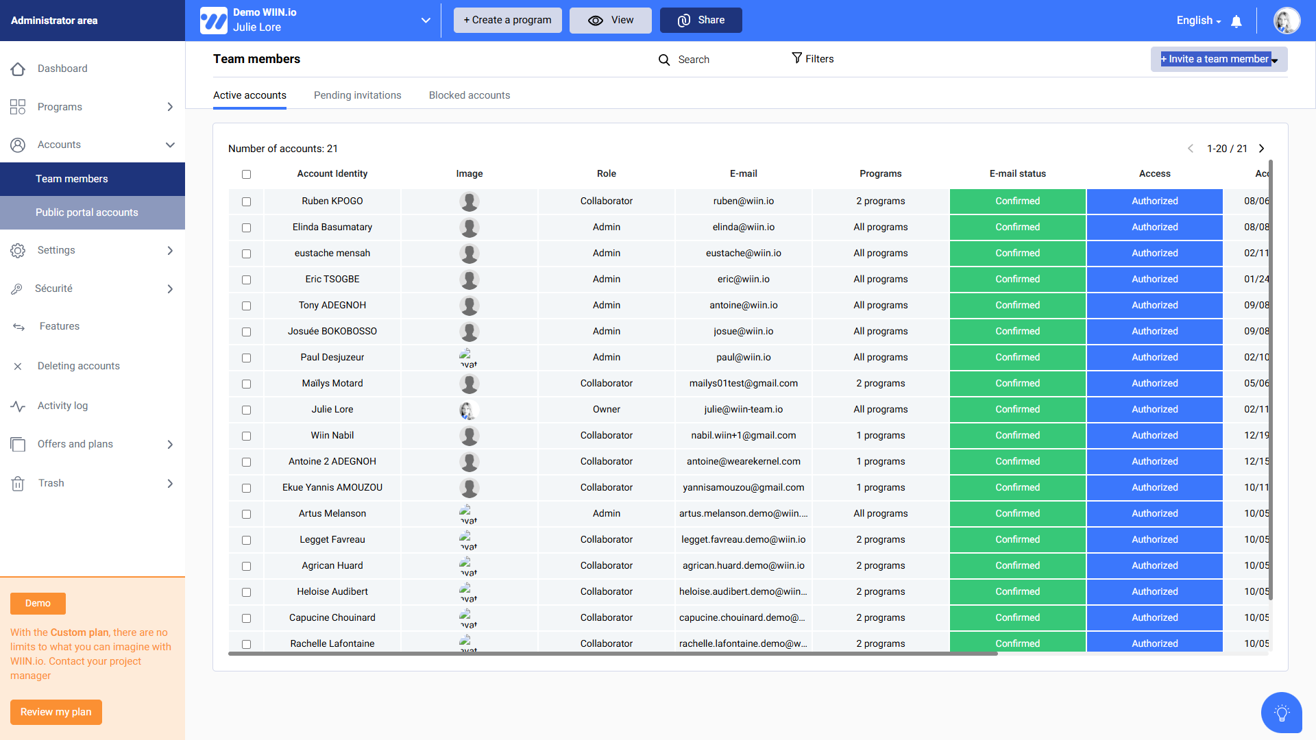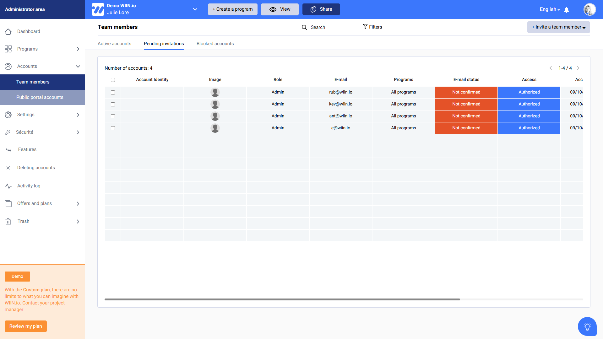 Comment inviter un administrateur sur la plateforme ? Sur la plateforme Wiin.io, vous avez la possibilité d'inviter des administrateur à l'échelle de la plateforme. Pour ce faire, accédez à l'espace administrateur, Cliquez sur le menu "Comptes", puis ...
