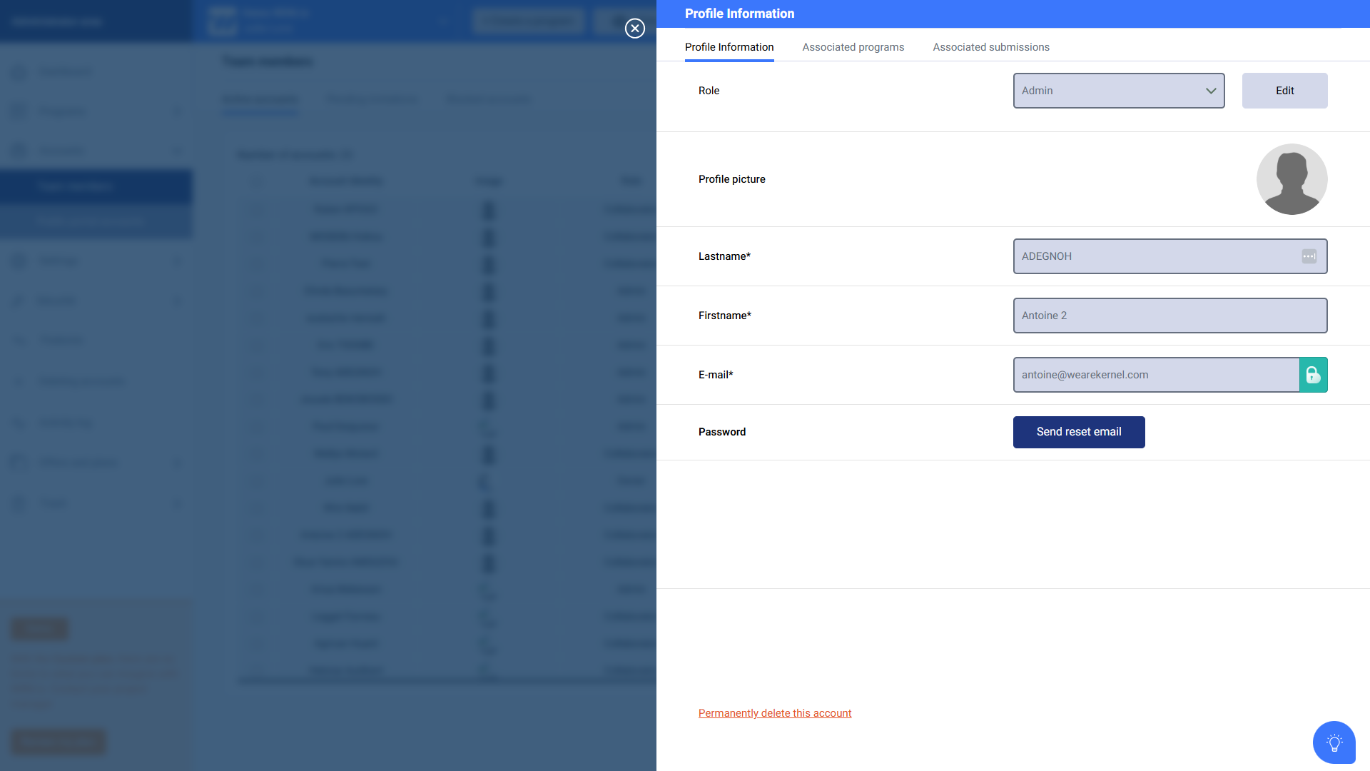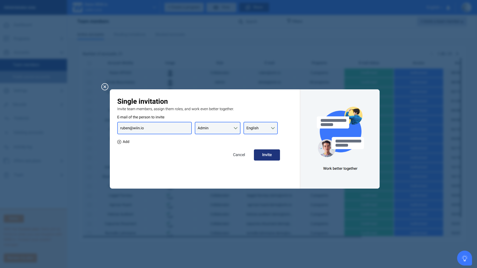 Cliquez sur le menu "Comptes", puis sur le bouton "Inviter un membre d'équipe".