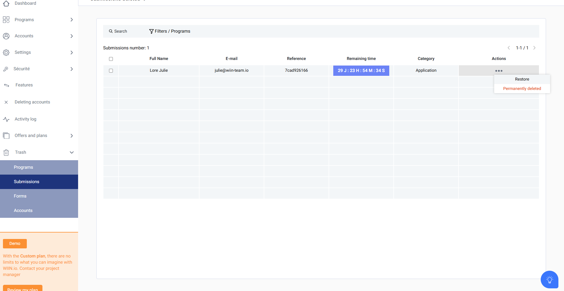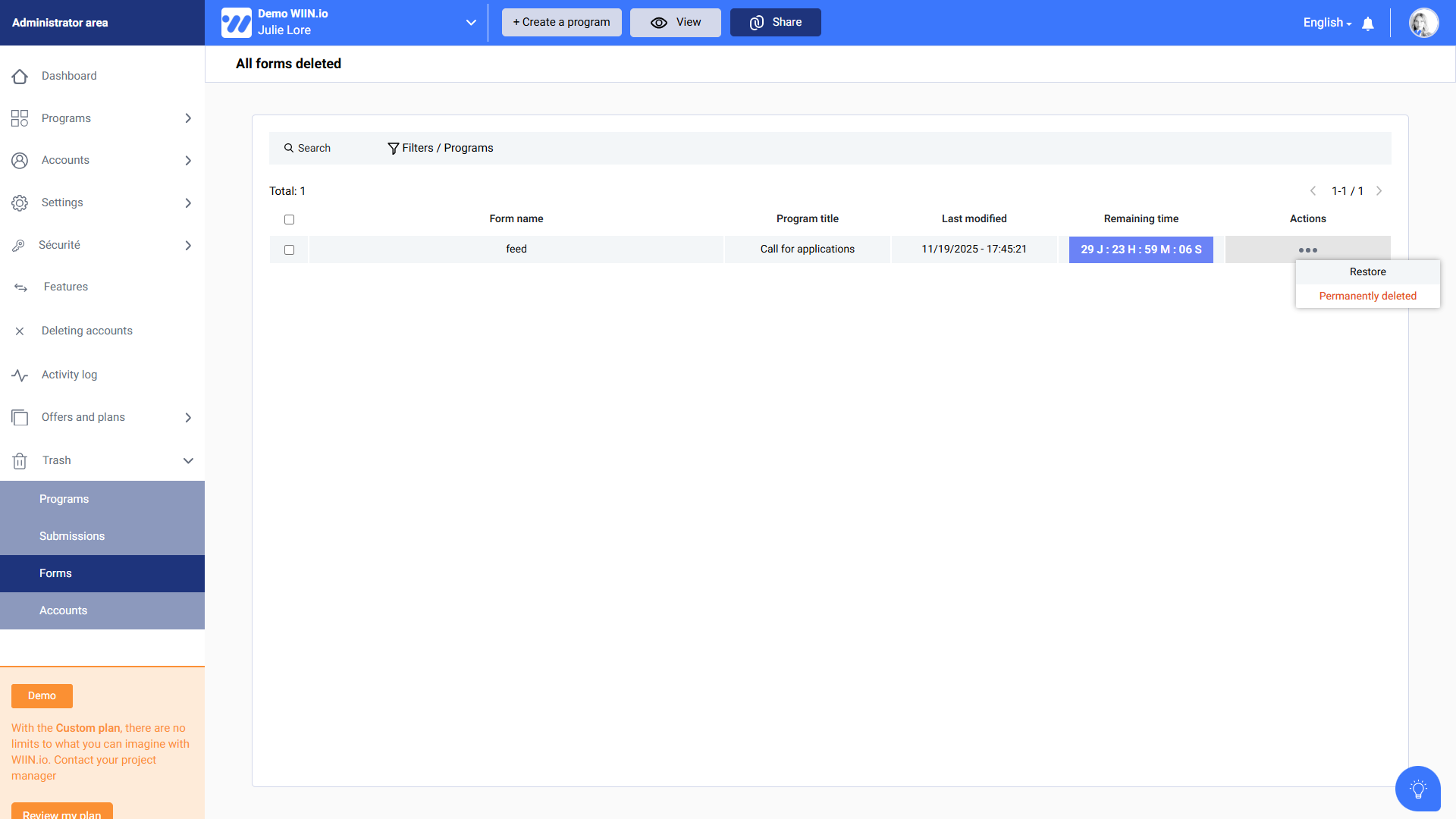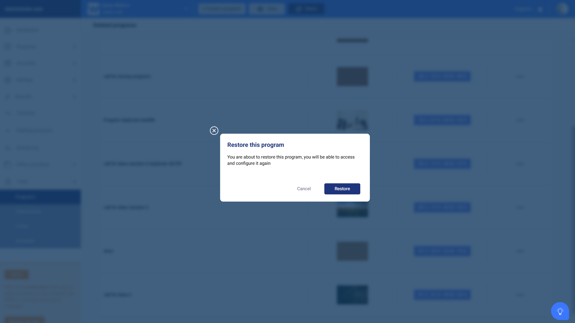 Lorsqu'un programme est supprimé sur la plateforme, il est déplacé vers le sous-menu " Programmes " de la corbeille. Tous les programmes supprimés sont stockés dans ce sous-menu. Dans la colonne "Actions", en cliquant sur les trois points, vous pouvez choisir de restaurer ou de supprimer définitivement ce programme.