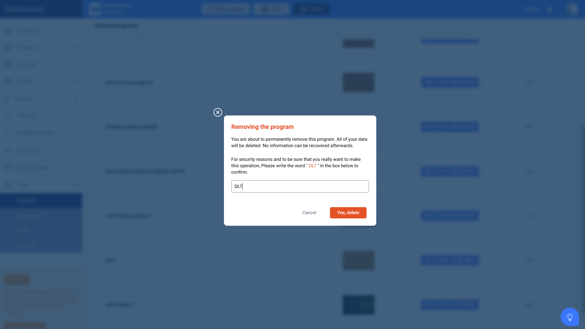 - Vous avez la possibilité de supprimer définitivement votre programme avant la fin des 30 jours en choisissant l'option "Supprimer définitivement" dans la colonne Actions, puis en saisissant "DLT" et en cliquant sur "Oui, supprimer".