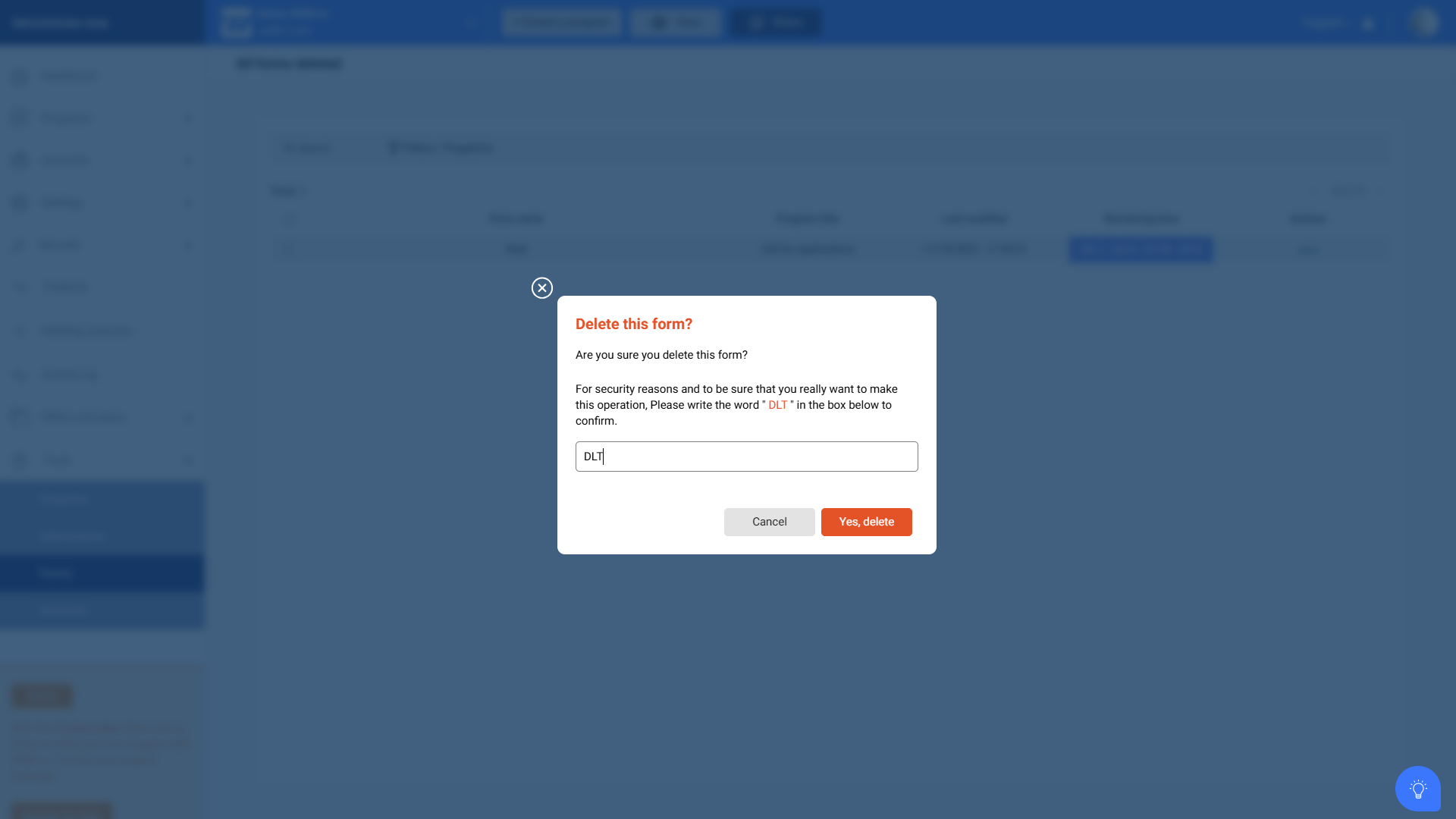 - Vous avez la possibilité de supprimer définitivement votre formulaire avant la fin des 30 jours en choisissant l'option "Supprimer définitivement" dans la colonne Actions, puis en saisissant "DLT" et en cliquant sur "Oui, supprimer".